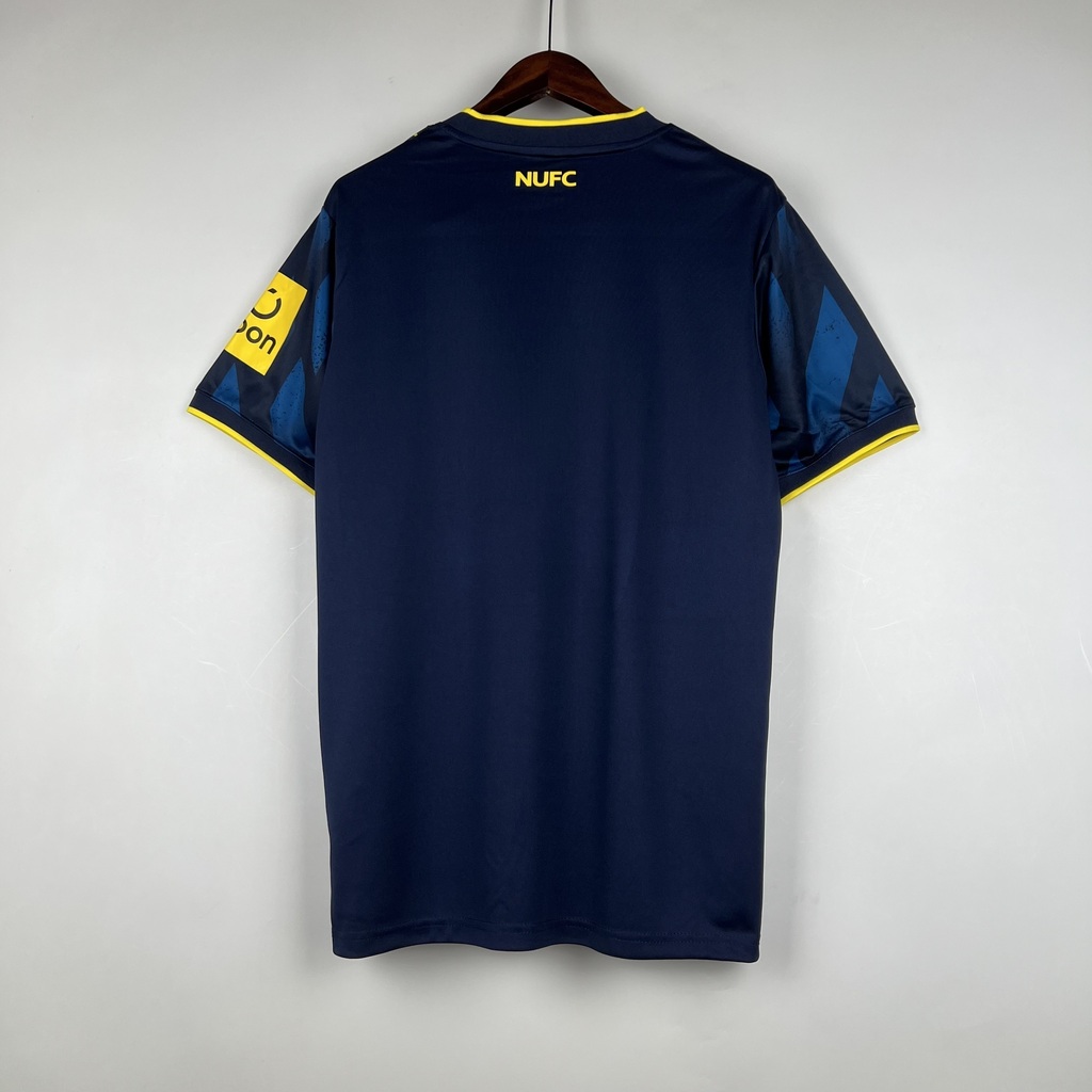 A gola é azul com contorno amarelo, mesmo padrão dos punhos. A sigla NUFC é disposta na nuca, em amarelo.