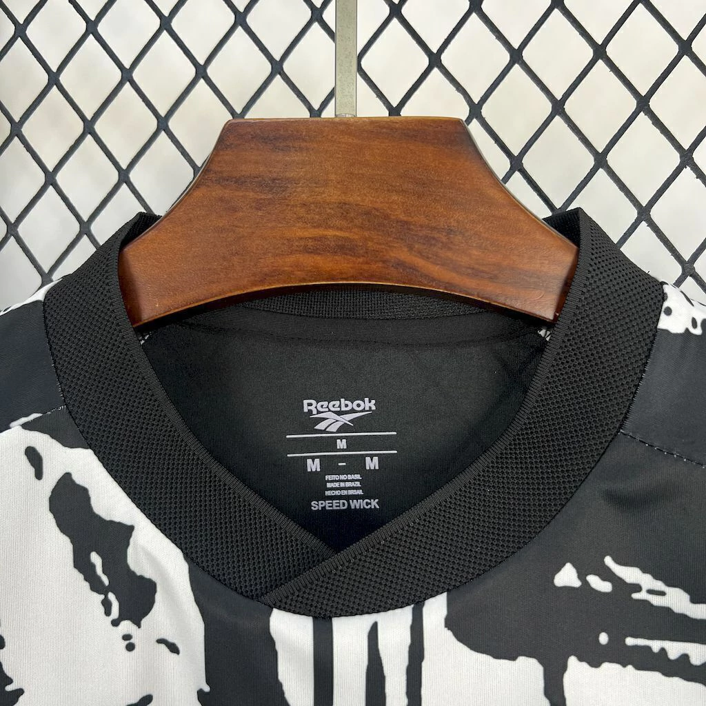 O escudo do clube está no lado esquerdo do peito, numa versão dourada e preta, enquanto o logo da Reebok ganha o lado direito, em dourado. Já o patrocínio master da vbet ganha o espaço nobre em branco. Na barra da camisa, vai uma jocktag com o mote da campanha “Aura 90”.
